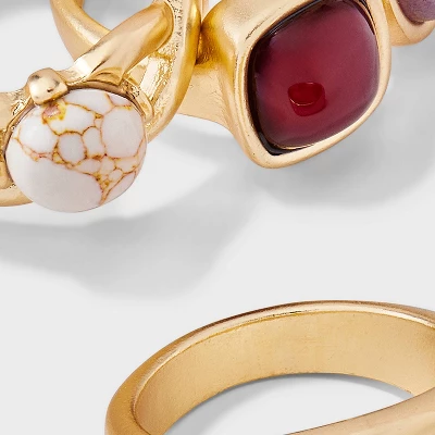Refresh your accessory collection with the 3-Piece Embellished Ring Set from Universal Thread™. This set includes three rings — one featuring a white howlite stone, another ring with two lepidolite stones and one adorned with beautiful raised designs — for a classic look. Designed in a gold finish, these rings are a versatile addition to your everyday jewelry collection.