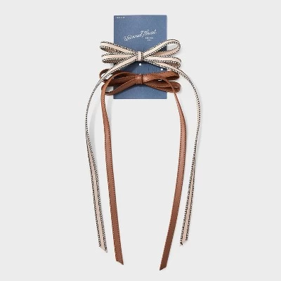 Add a polished touch of flair to your hairstyle with this 2-Piece Long Tail Bow Hair Clip Set from Universal Thread™ . This set includes two clips topped with a double-bow design — one in off-white faux leather with black stitched detailing and the other in brown faux leather with tonal stitching accents— both featuring long tails for a standout look. With two in the set, you’ll always have the perfect hair accessory ready to switch up any look.