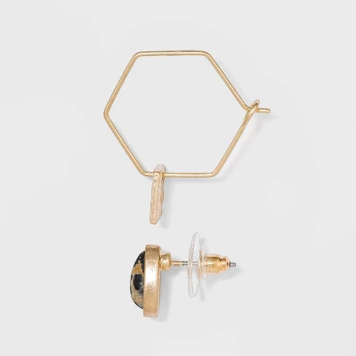 Elevate your accessory game with the Semiprecious Brown Lip Shell & Jasper Multi-Earring Set from Universal Thread™. This multipack of earrings includes eight pairs in varying shapes and sizes so you can mix and match options to complement all of your looks. Designed with an elegant gold-tone finish to add subtle shine, this multi-earring pack includes six pairs of studs in cutout, coin and teardrop designs, twisted oval drops and slim-wired hexagon hoops that are sure to add stylish flair with their chic, modern design.