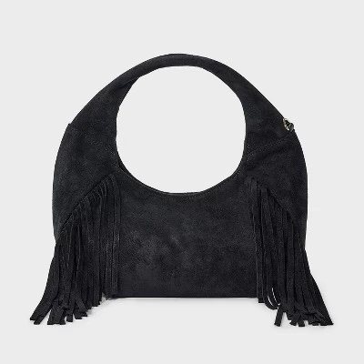 Add celestial charm to your bag collection with the Soft Fringe Crescent Handbag from Universal Thread™. This handbag is designed in the shape of a crescent moon with fringe detailing for a standout look. It comes with a main compartment with an interior pocket to help keep cell phone and other items separate. Made of faux suede fabric, this lightweight handbag is great for your own or gifting. Plus, it has double handles for easy carrying.