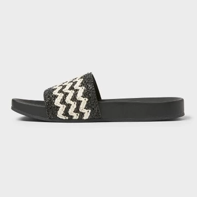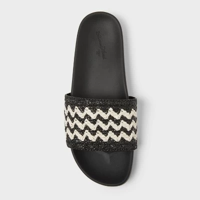 Step into laid-back chic summer looks in these Chloe Raffia Footbed Slide Sandals from Universal Thread™. Woven with black and white raffia texture for earthy appeal, these slip-on slides have a round, open toe for maximum comfort and breathability. They feature a cushioned footbed and a medium width, perfect for long beach days or sunny days on the boardwalk.