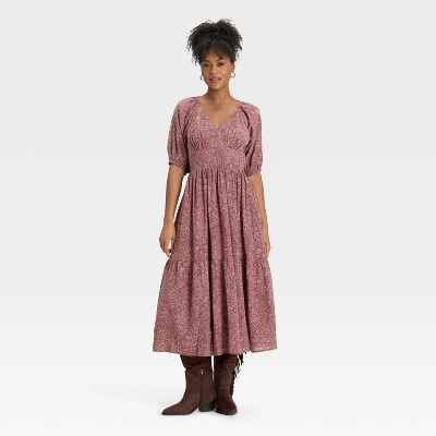 Glide through your day in effortless grace with this Puff Elbow-Sleeve Printed Maxi A-Line Dress from Universal Thread™. Crafted for both style and comfort, the pullover dress is made from a lightweight woven fabric blend of cotton and viscose. It’s adorned with a printed pattern and features a V-neckline shirred bodice with a fitted-front waist, puff elbow-length sleeves, back elastic and a soft-pleated maxi-length skirt with a tiered silhouette. Pair it with sandals, sneakers, pumps or boots for a variety of versatile looks.