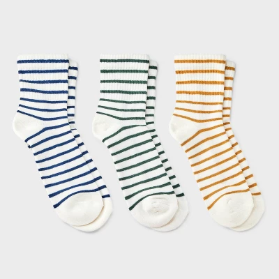 Step into comfort with the Women’s Striped Cushioned 3pk Mid Crew Socks from Universal Thread™ 4-10. Designed with a midweight knit fabric, these quarter-length socks offer a perfect balance of softness and durability. The cushioned sole provides extra support with every step, while the smooth toe seams help prevent irritation for all-day use. Featuring striped designs in assorted colors, this three-pack adds a stylish touch to your everyday essentials.